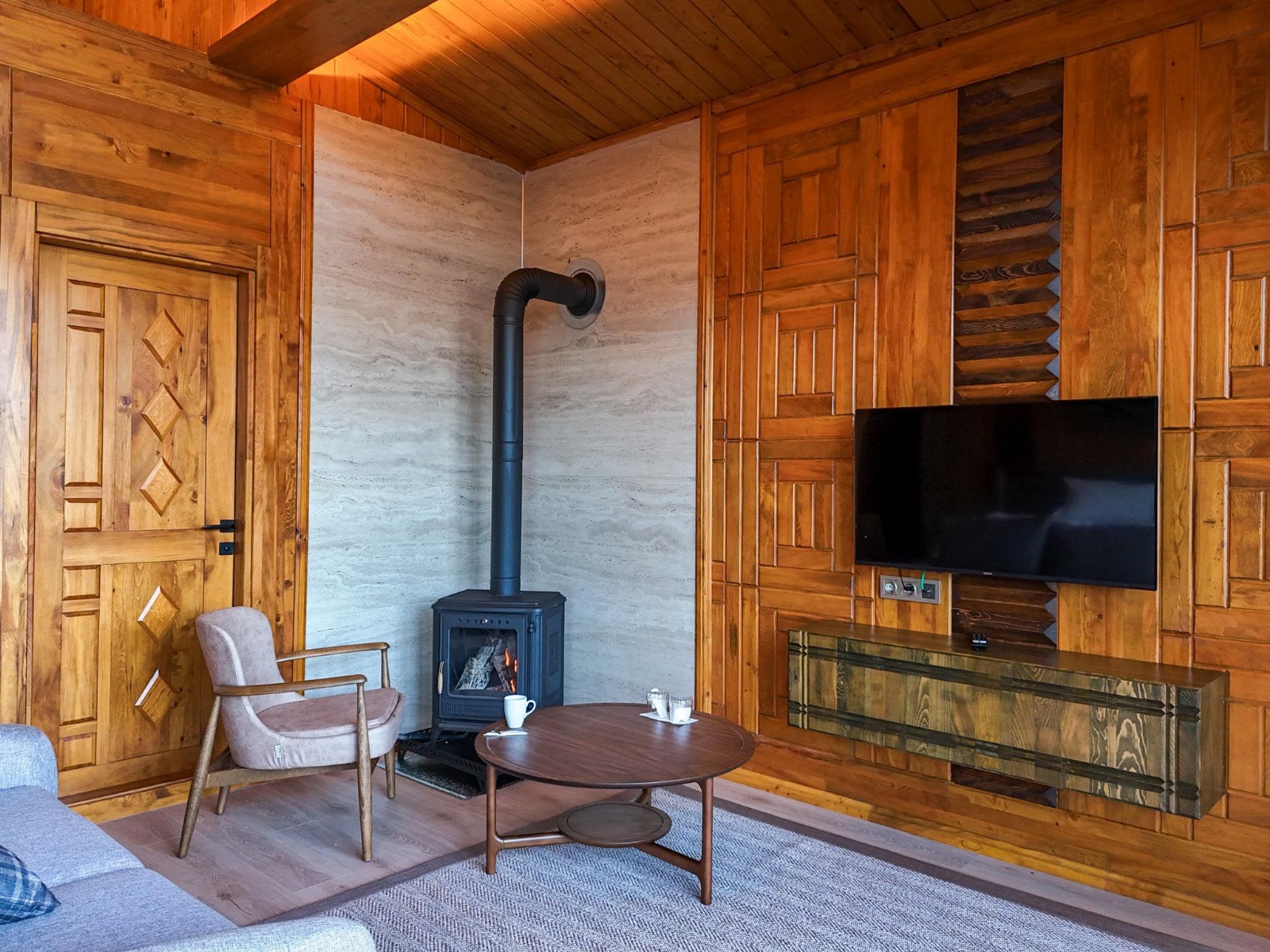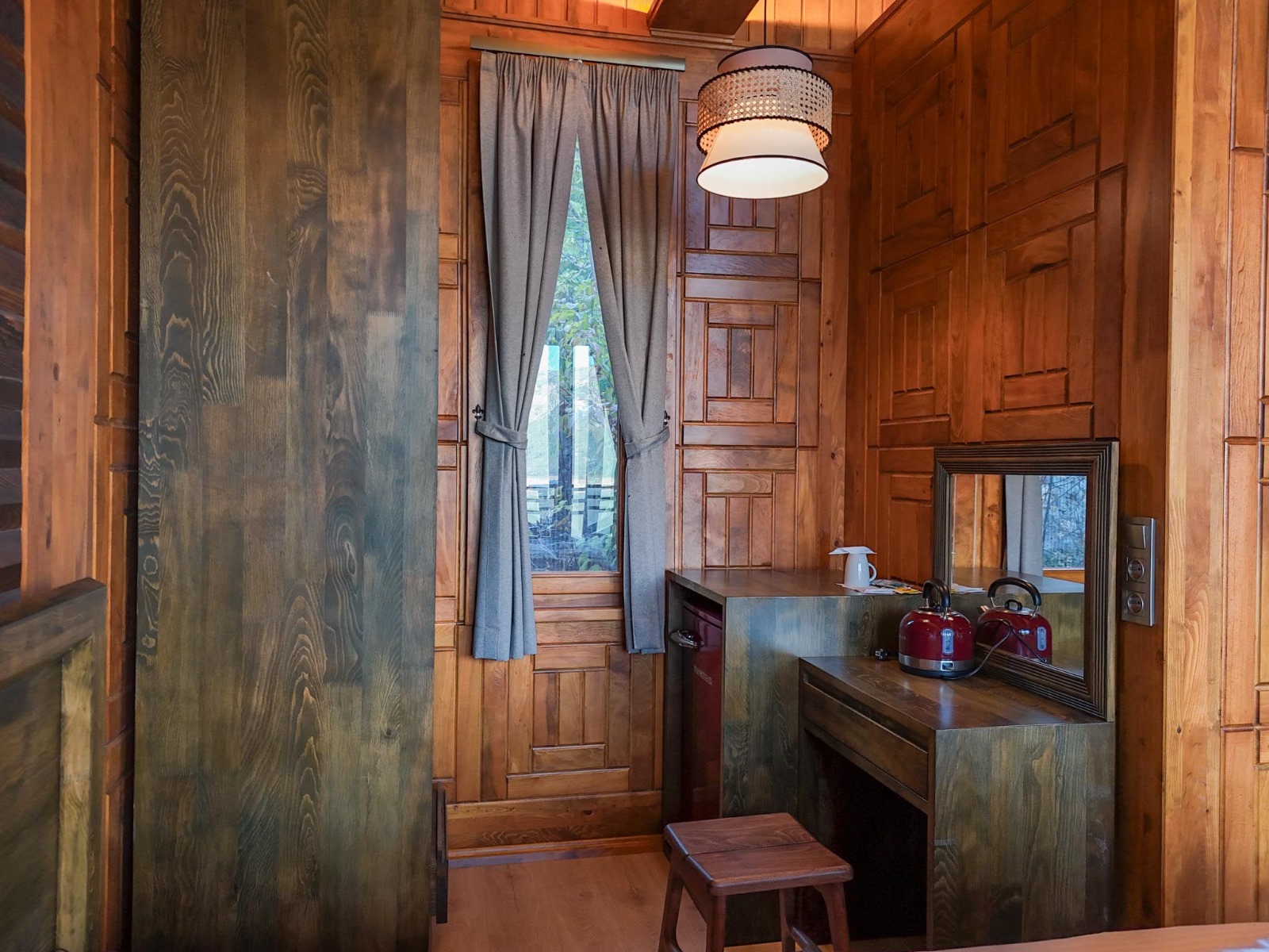 Ahşap dokuların doğallığıyla dekore edilen odada, günün ilk ışıklarını kuş sesleriyle karşılayabilir, göl manzarasına karşı taze bir nefes alabilirsiniz. Odada bulunan özel jakuzi, doğa manzarası eşliğinde hem ruhunuzu hem bedeninizi dinlendirmeniz için tasarlandı. Akşam olduğunda ise şömine başında sevdiklerinizle sıcacık sohbetler edebilir, romantik bir atmosferin tadını çıkarabilirsiniz. Şöminenin huzur veren alevleri, tatilinizi unutulmaz kılacak detaylardan sadece biri. Özel anlarınızı anlamlı kılmak, doğayla iç içe ama konforlu bir deneyim yaşamak istiyorsanız Sincap Yuvası tam size göre.